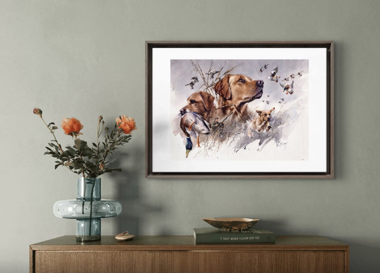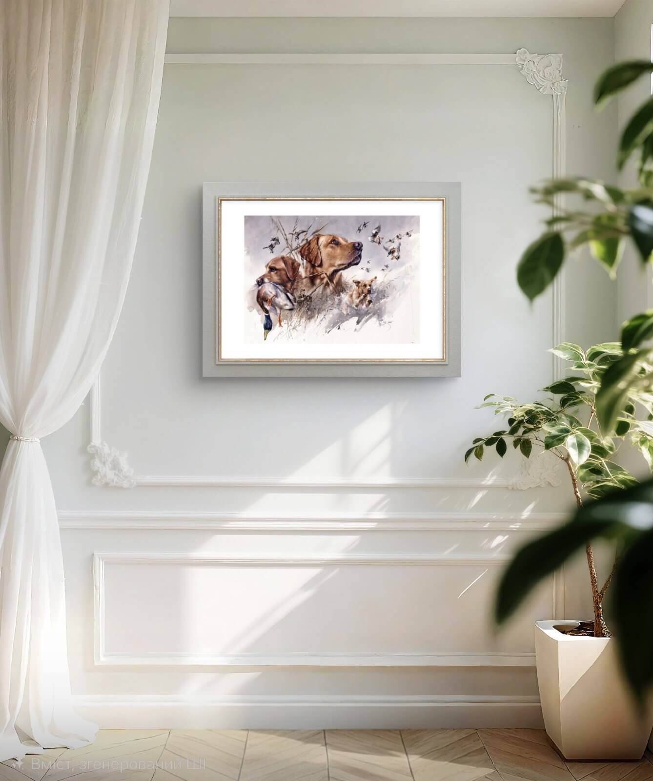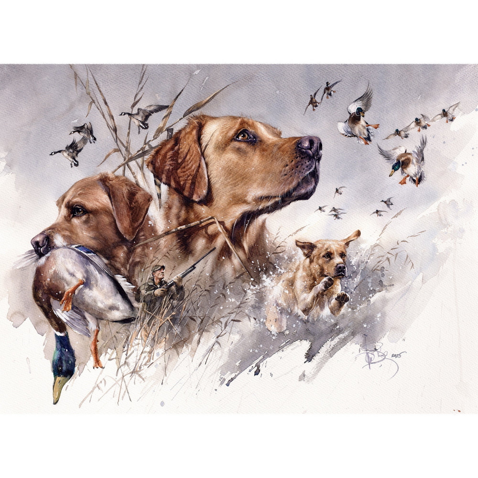 "Waterfowl Guardian" is a premium watercolor art print featuring a Labrador Retriever in an expressive waterfowl hunting scene. Perfect for collectors of duck hunting art, retriever prints, wildlife wall decor,...
