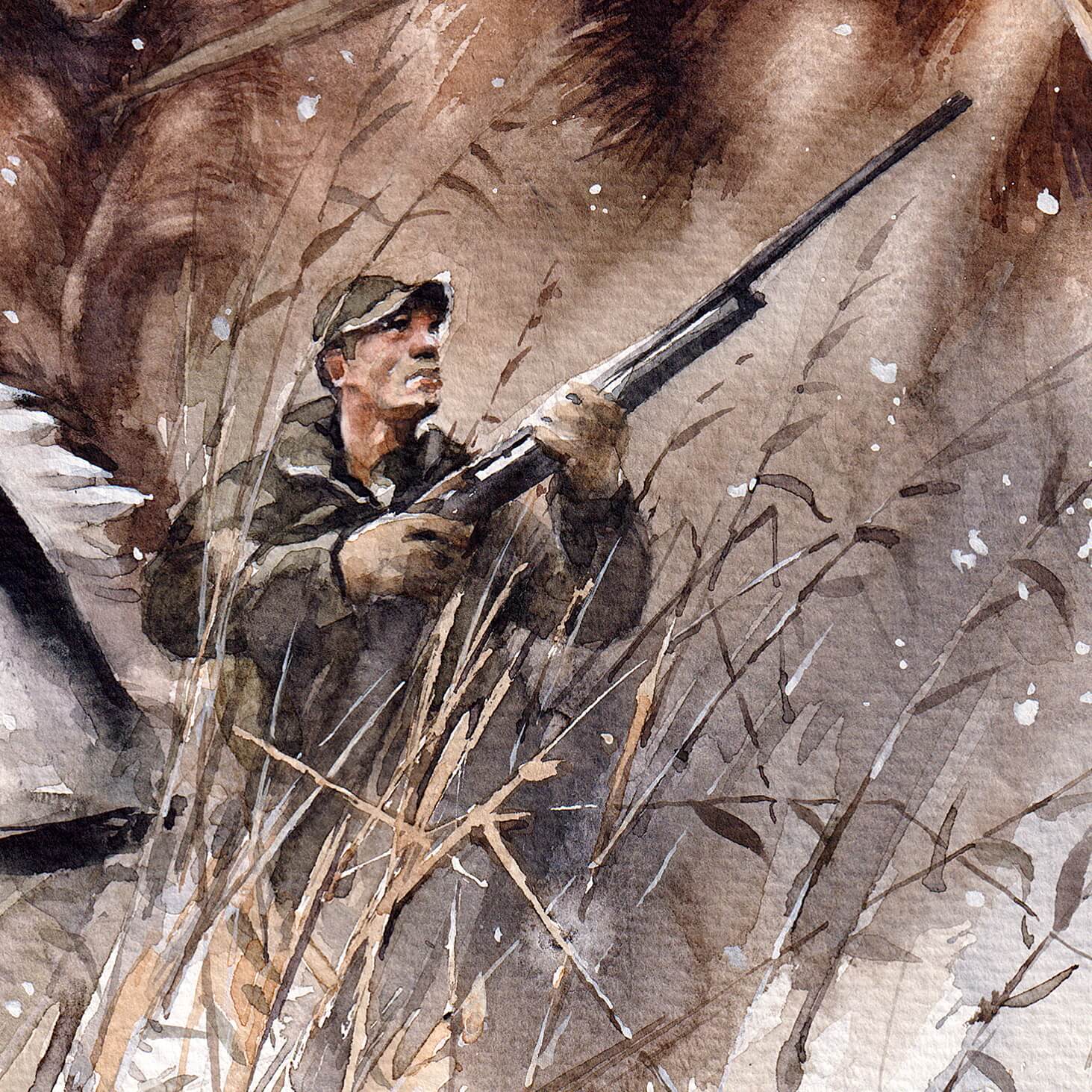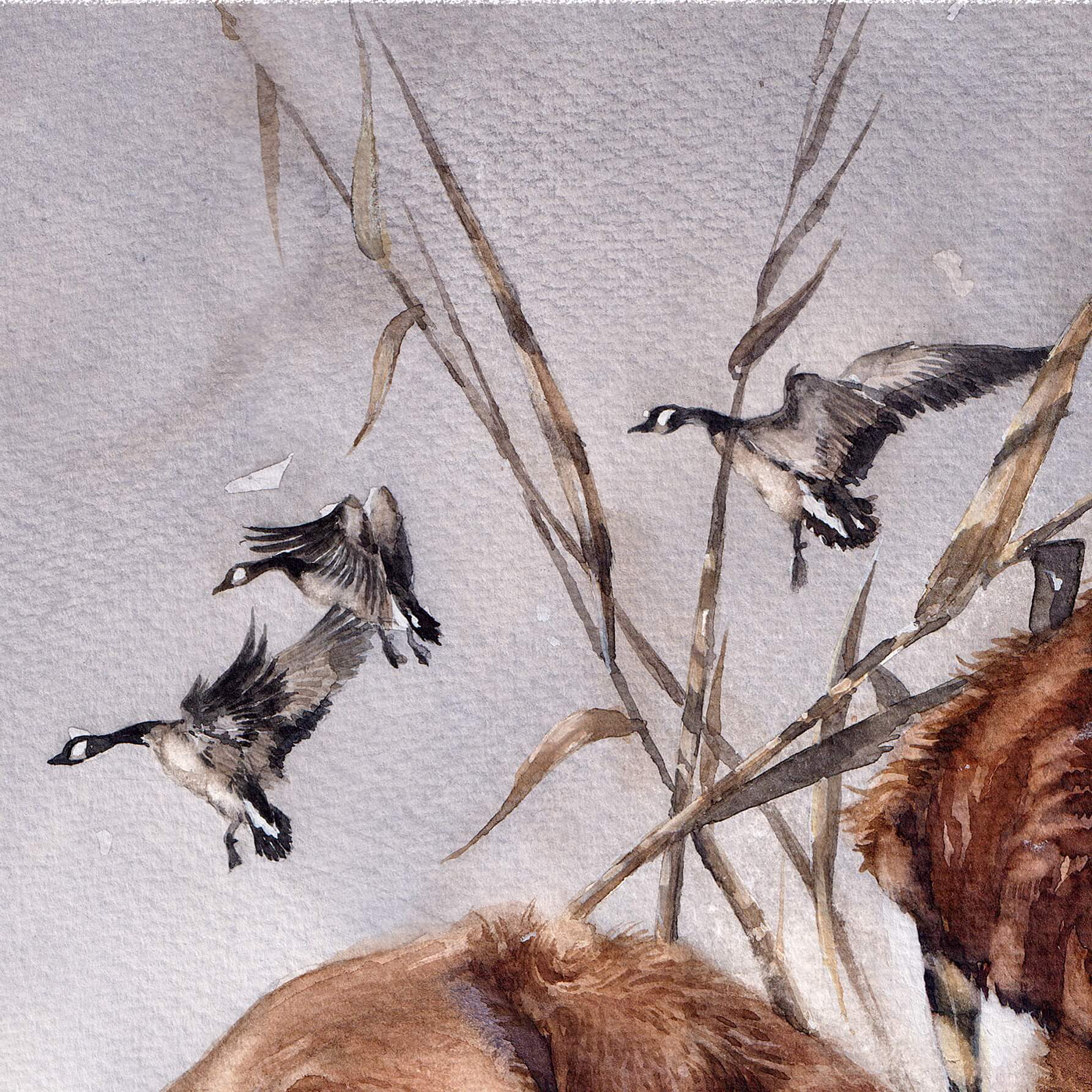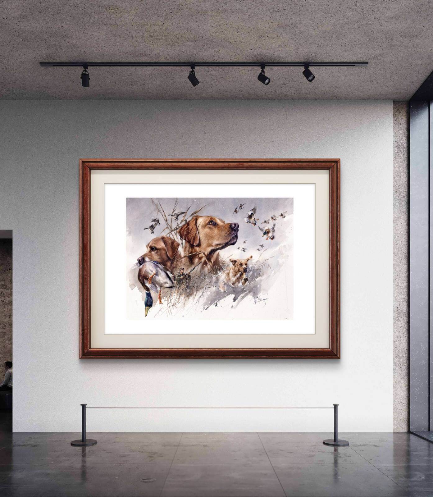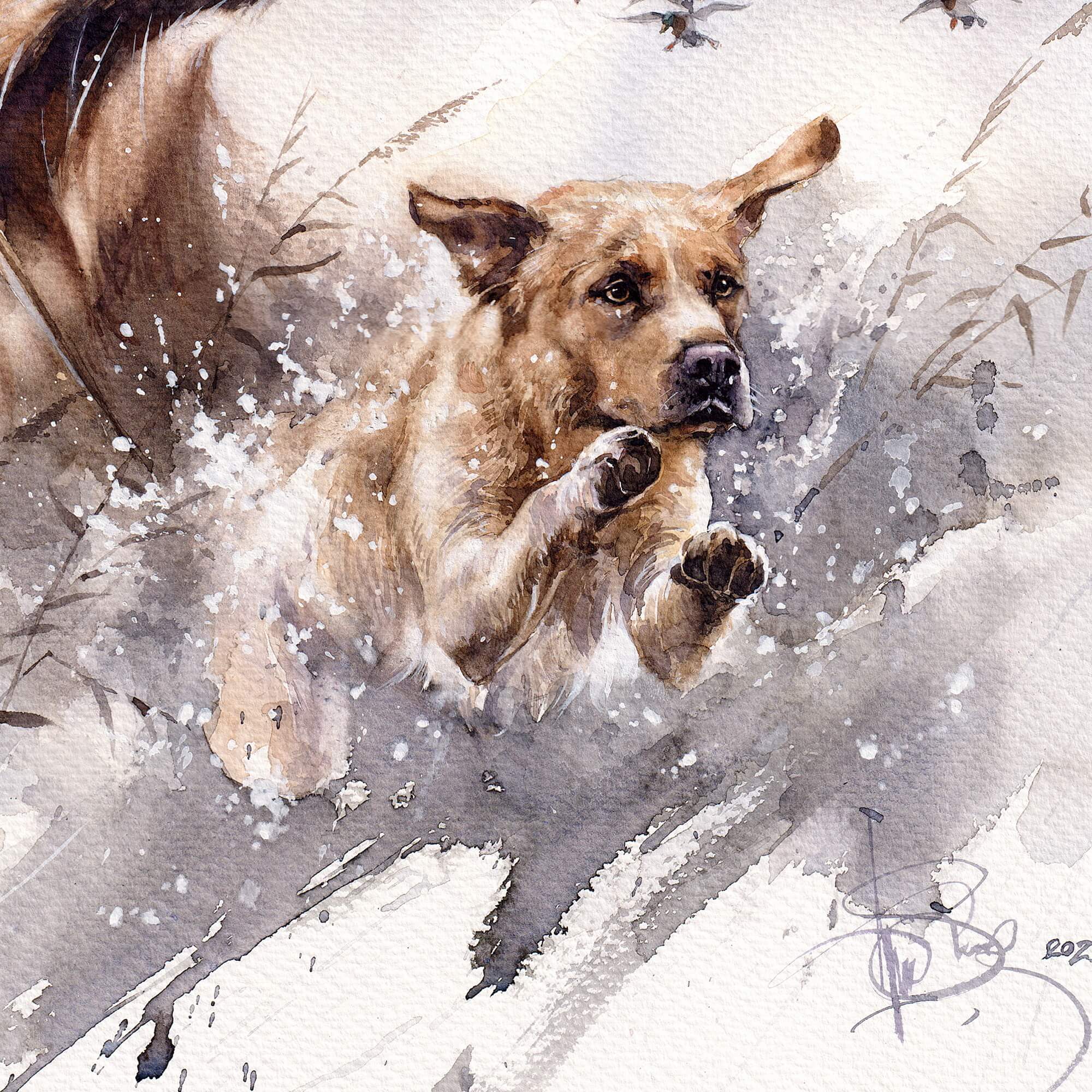 "Waterfowl Guardian" is a premium watercolor art print featuring a Labrador Retriever in an expressive waterfowl hunting scene. Perfect for collectors of duck hunting art, retriever prints, wildlife wall decor,...